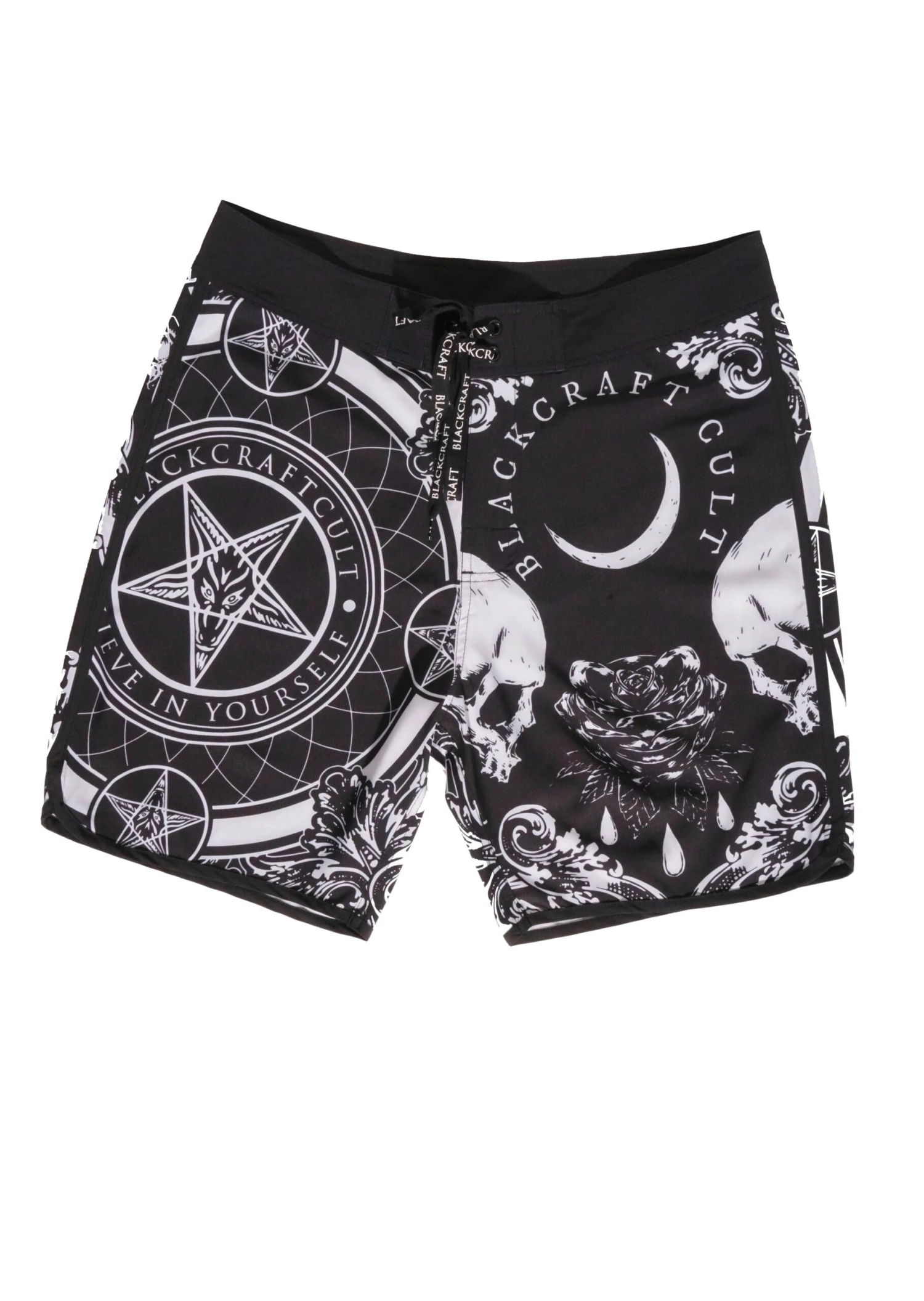 7″ inseam stretch men’s board short in Baroque Baph allover print. Solid black lace-up front and a back flap pocket features the Blackcraft logo.Â