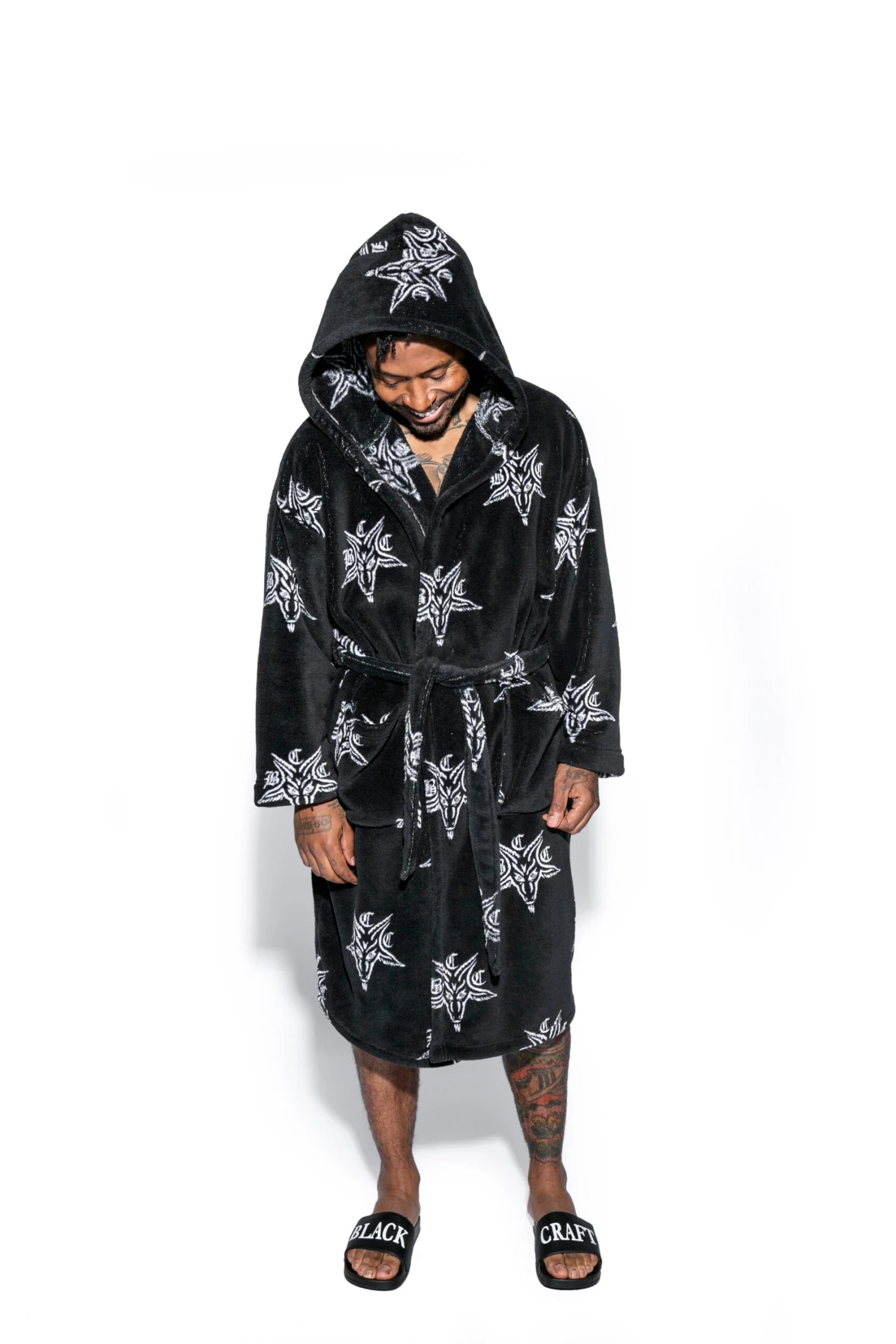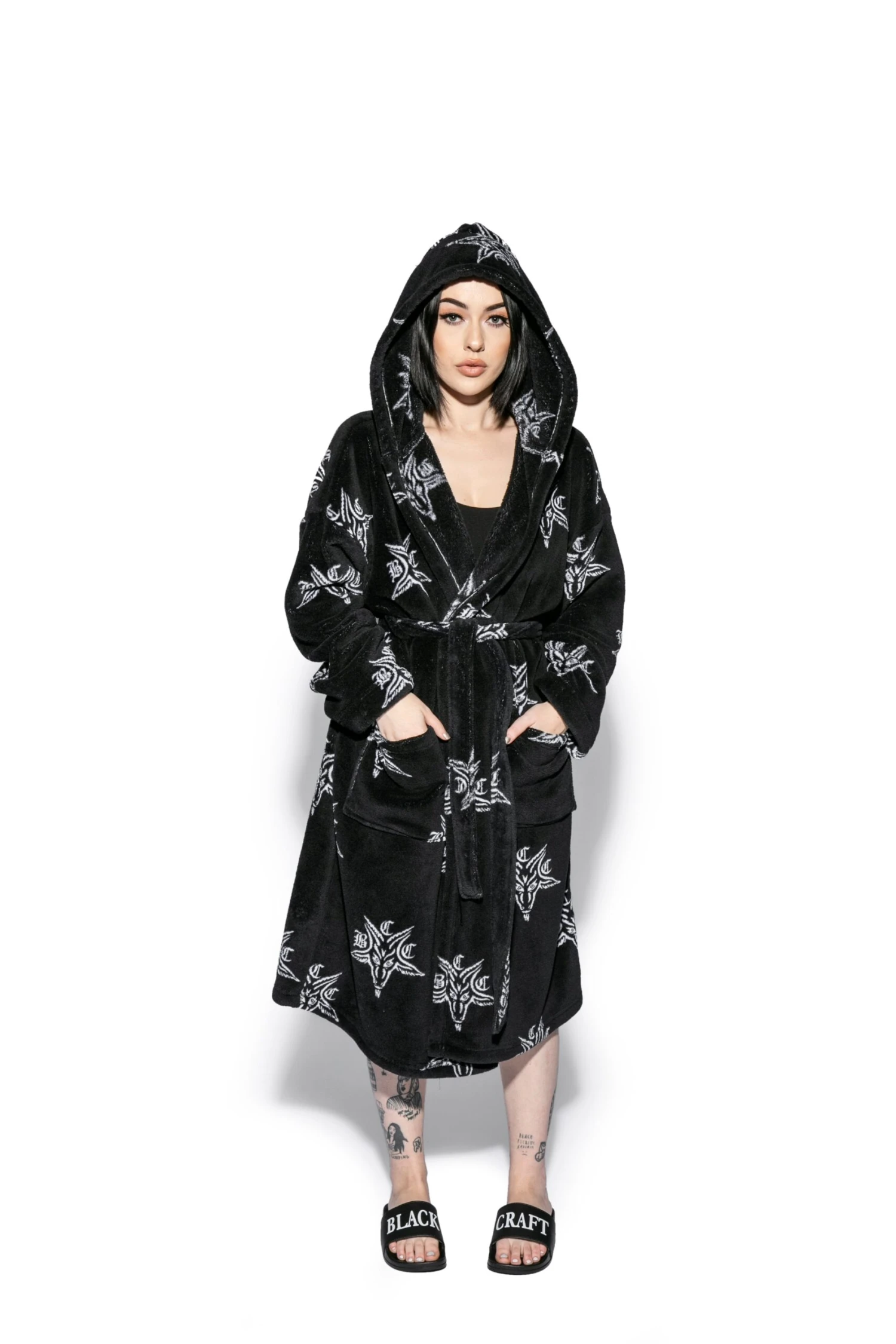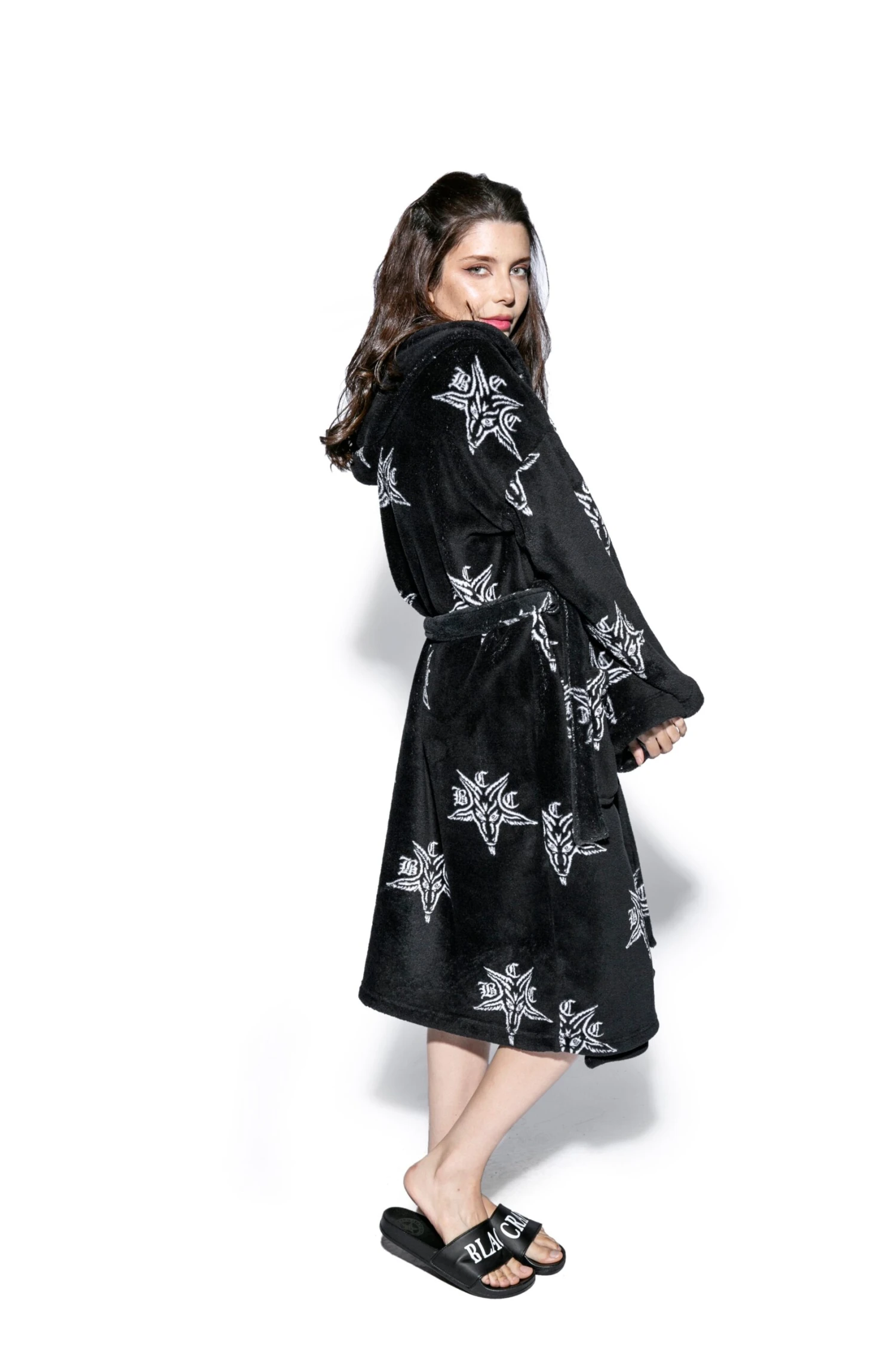 Cozy unisex robe with all over BCC Goat print. Features pockets, hood, and tie closure.