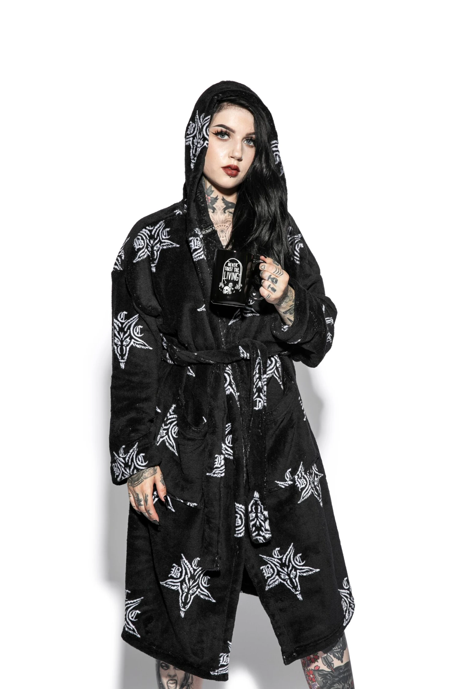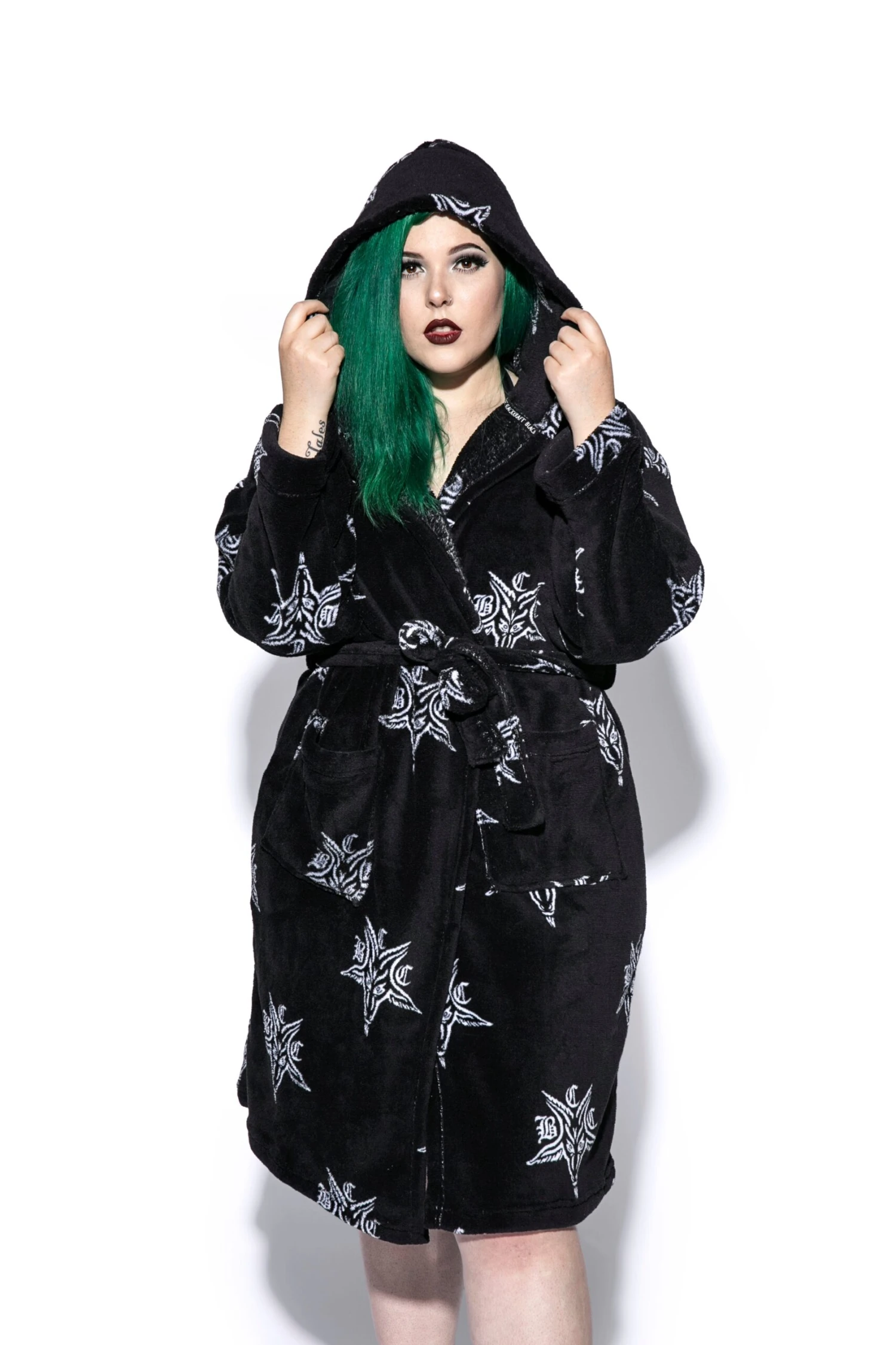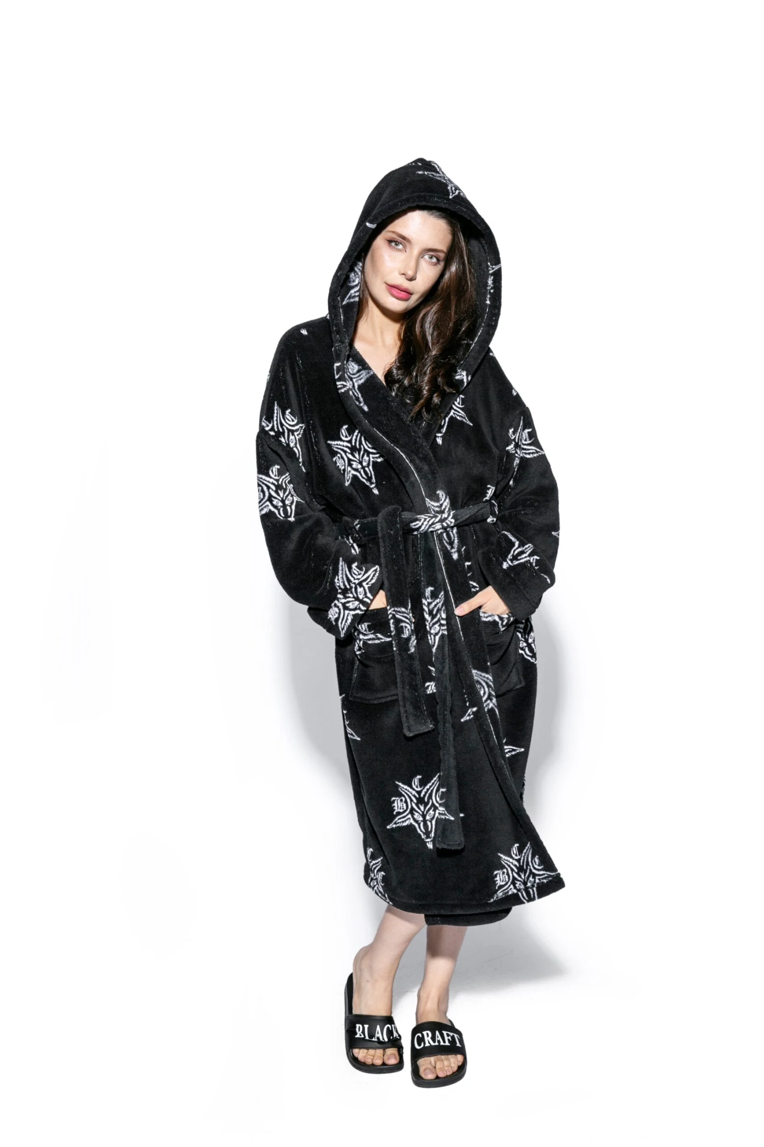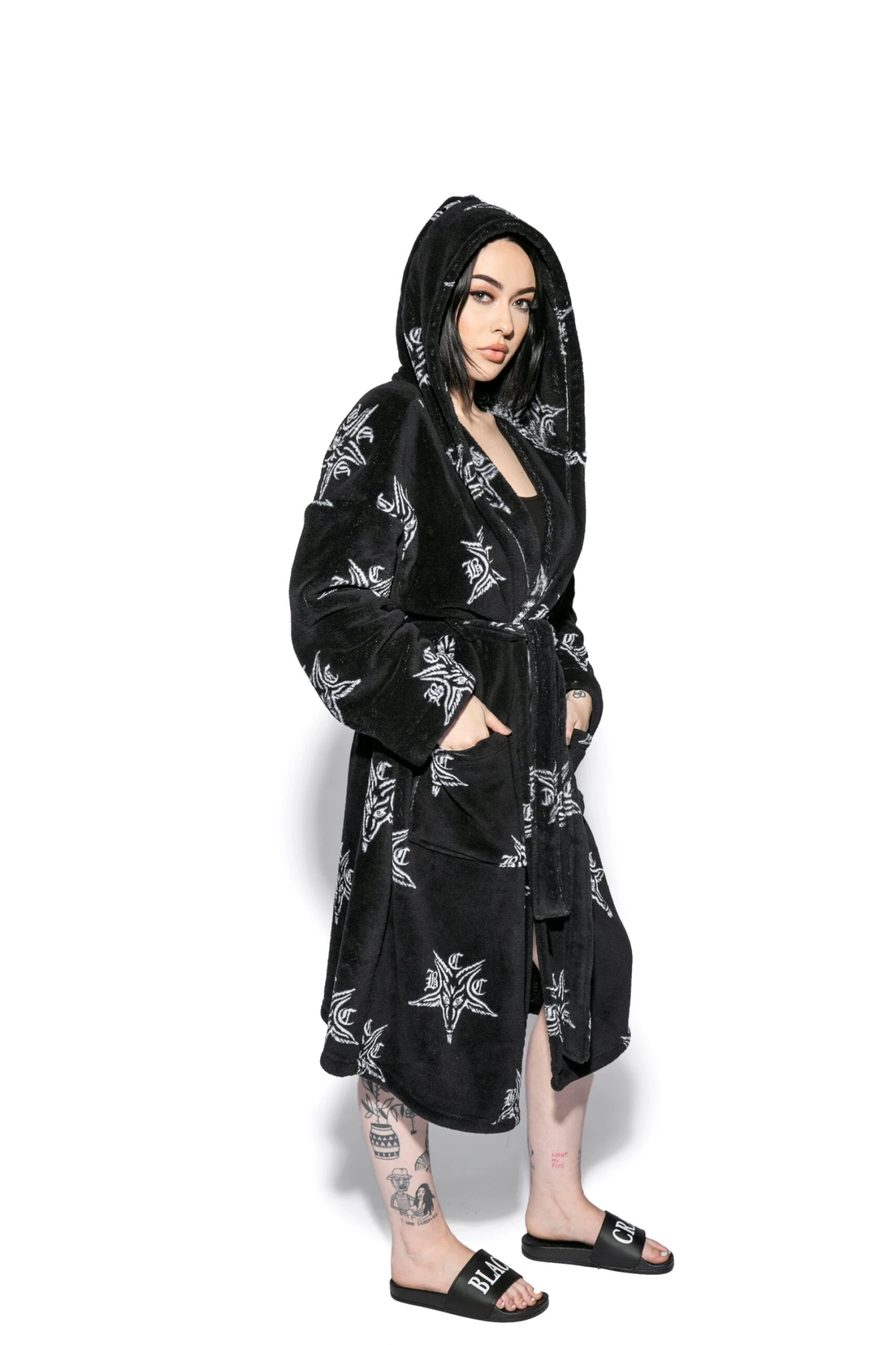 Cozy unisex robe with all over BCC Goat print. Features pockets, hood, and tie closure.