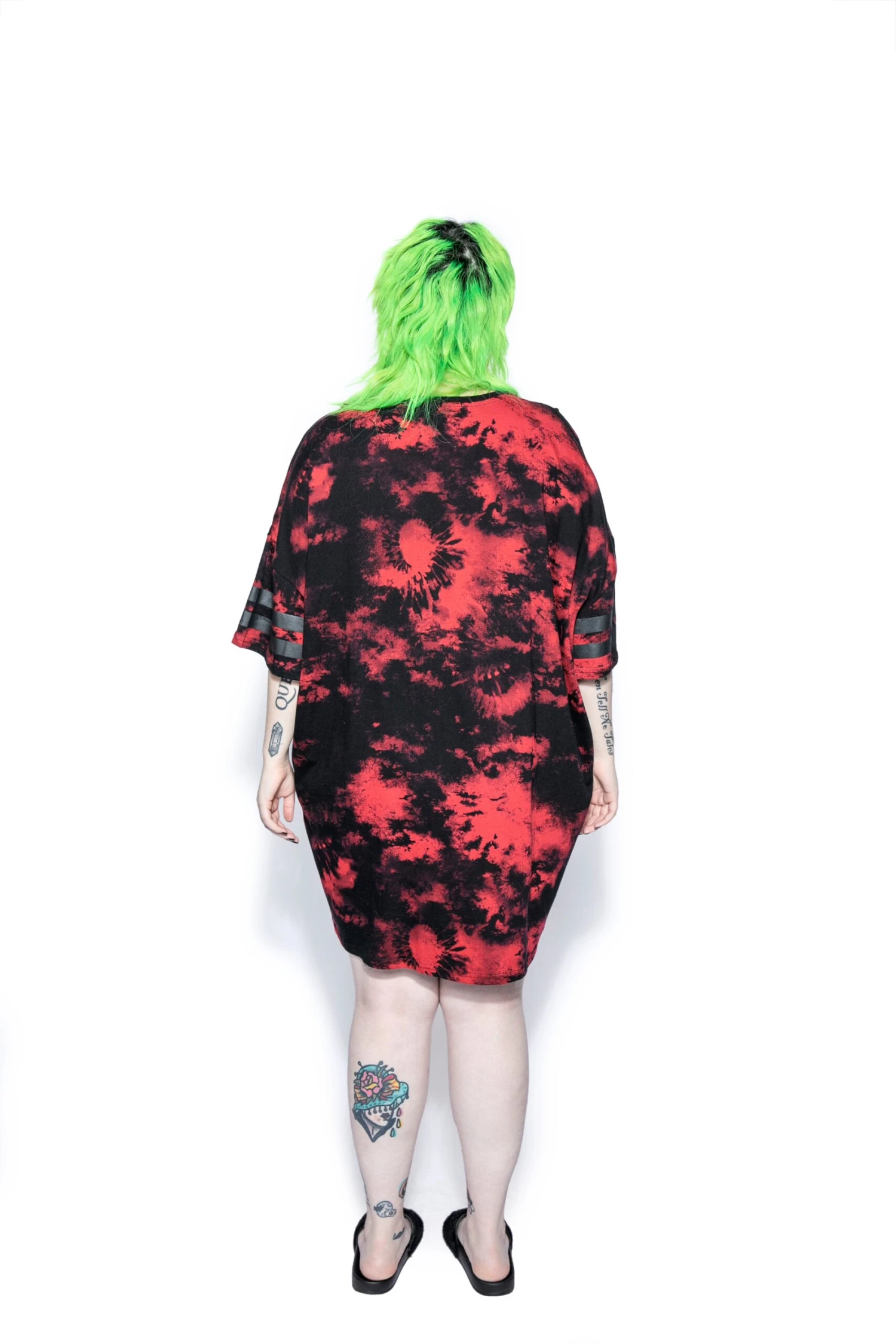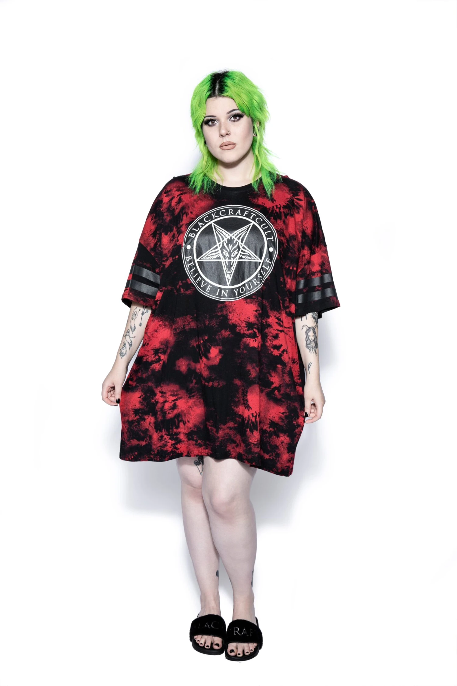 Junior and plus size dorm shirt in blood moon dye with Believe in Yourself logo print. Black stripe accents on sleeves.