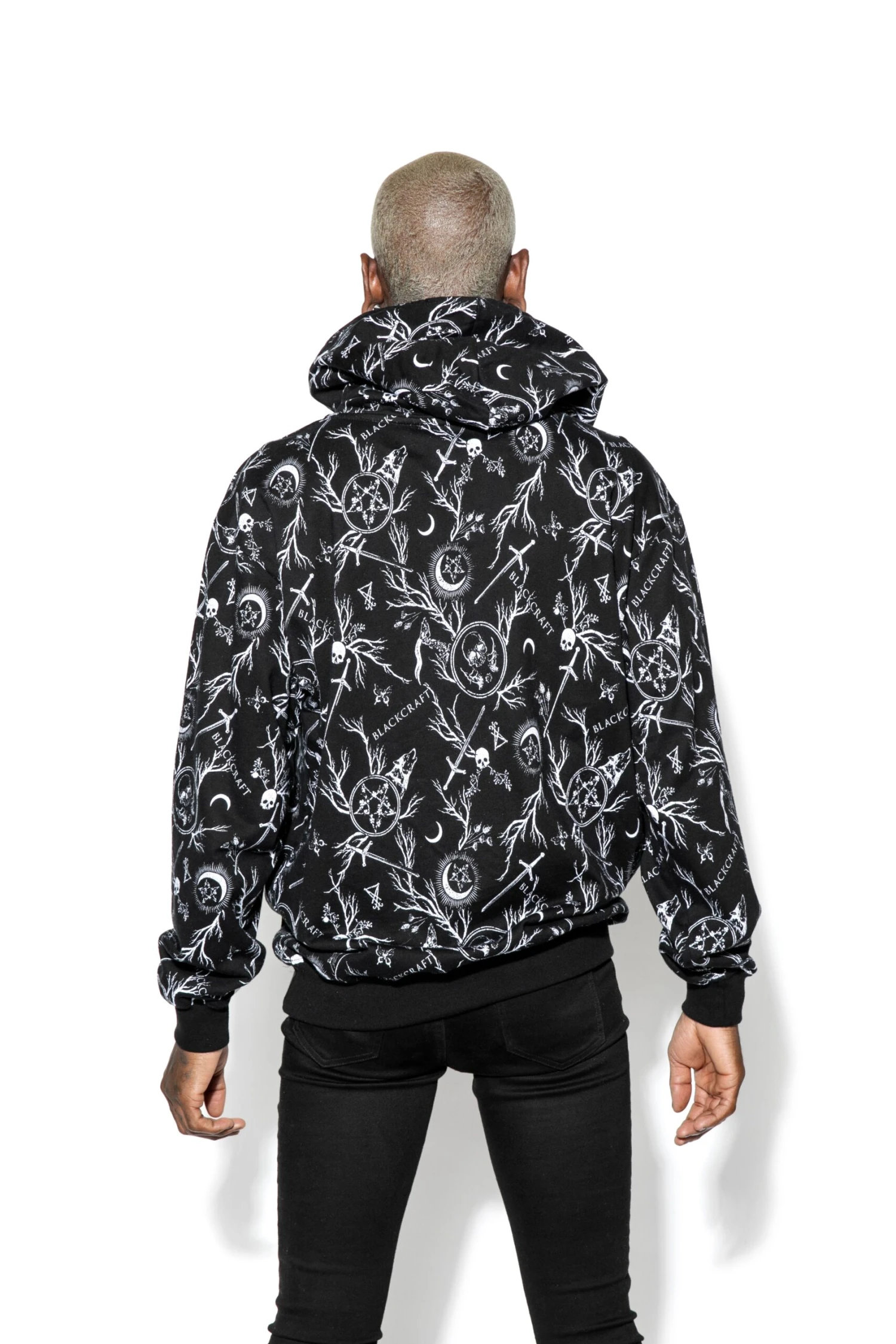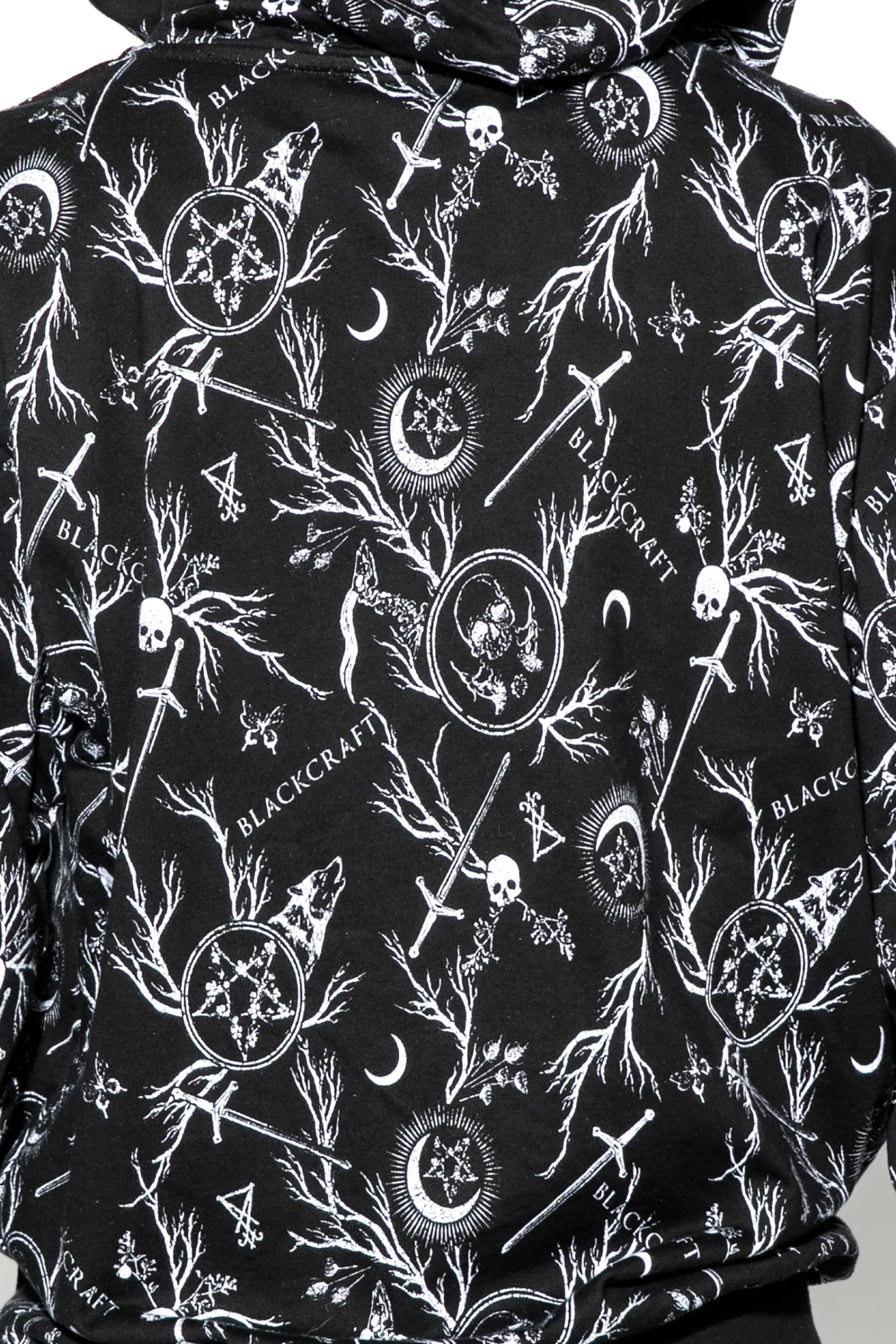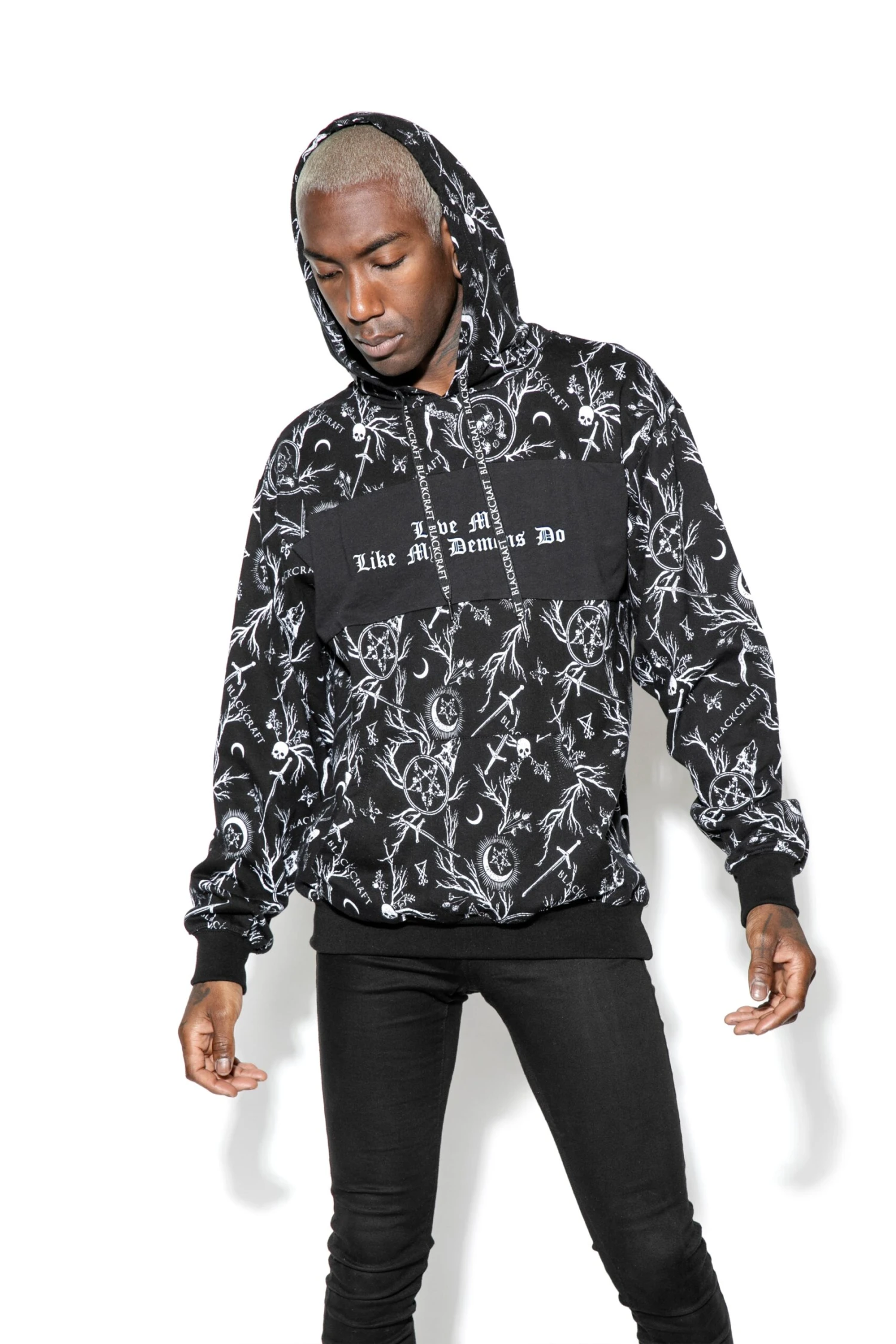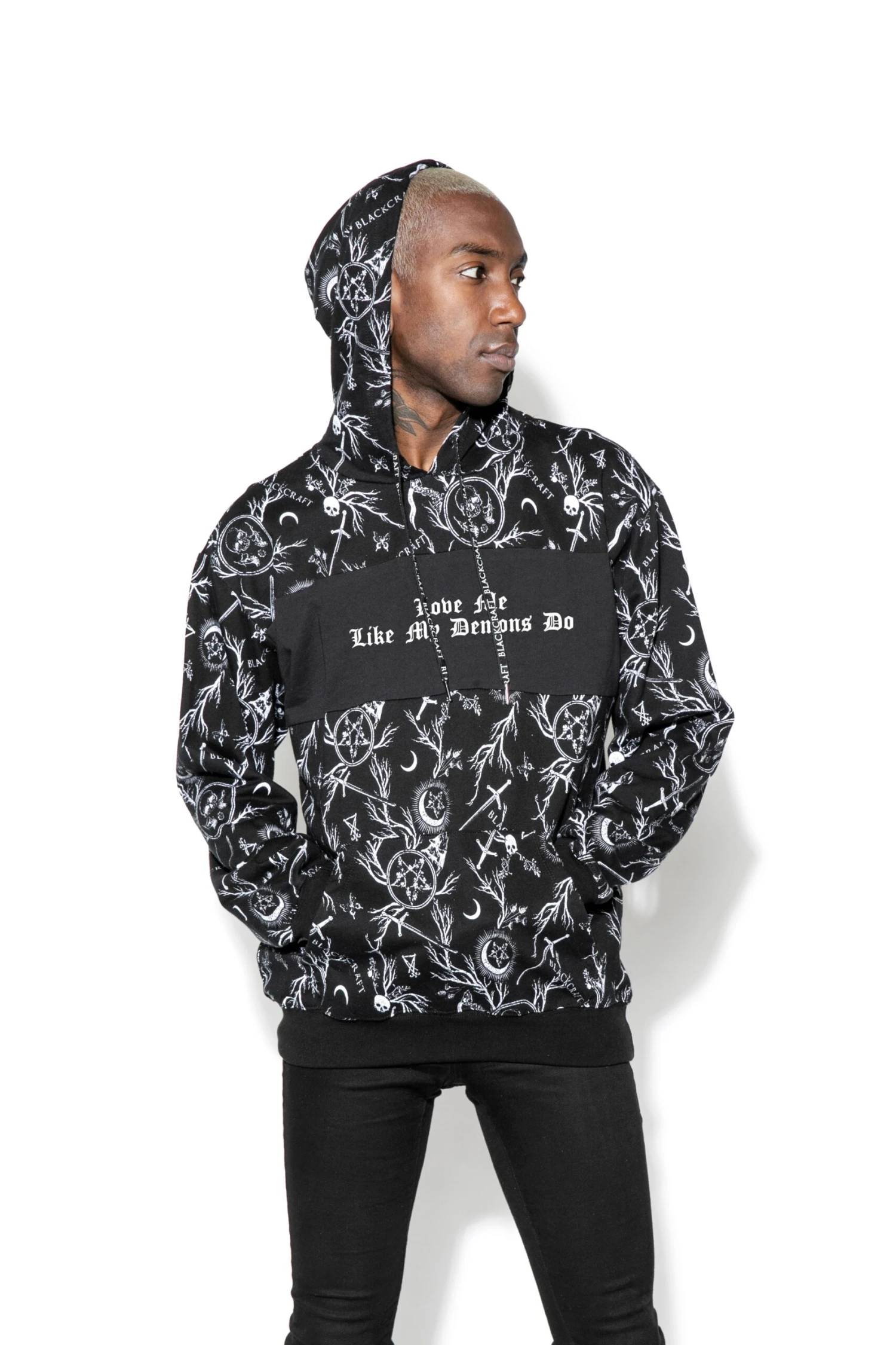 The Demons allover print hoodie has a black color block with Love Me Like My Demons Do across the chest. Custom Blackcraft drawstring.