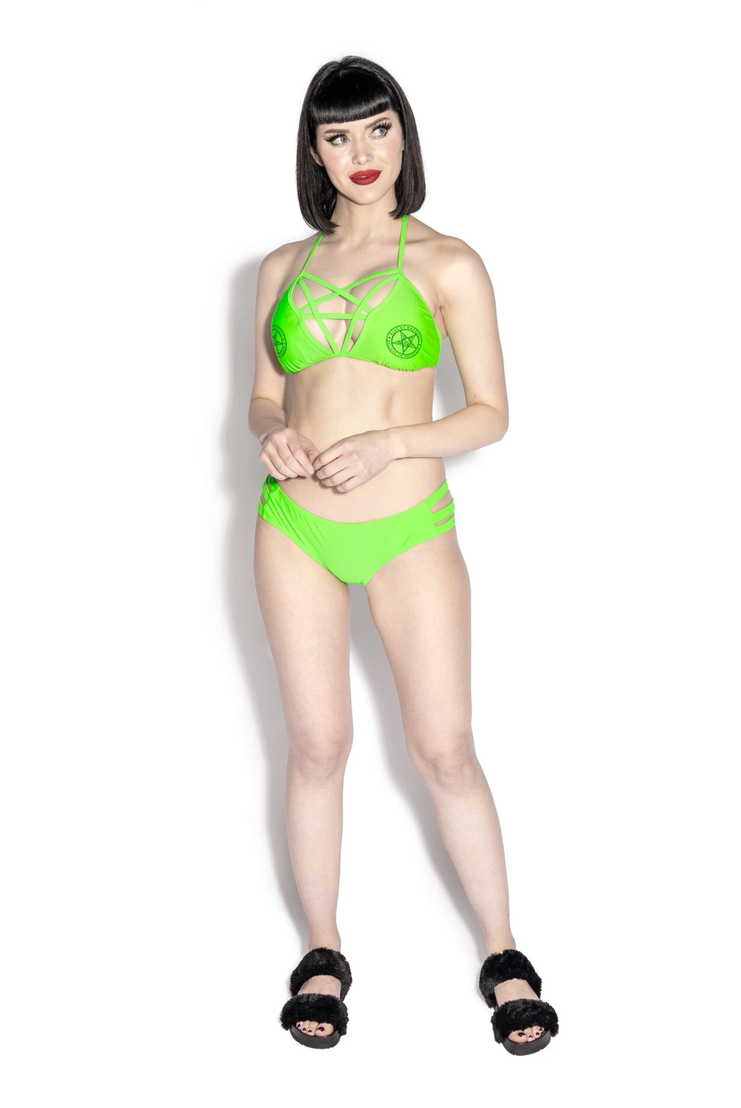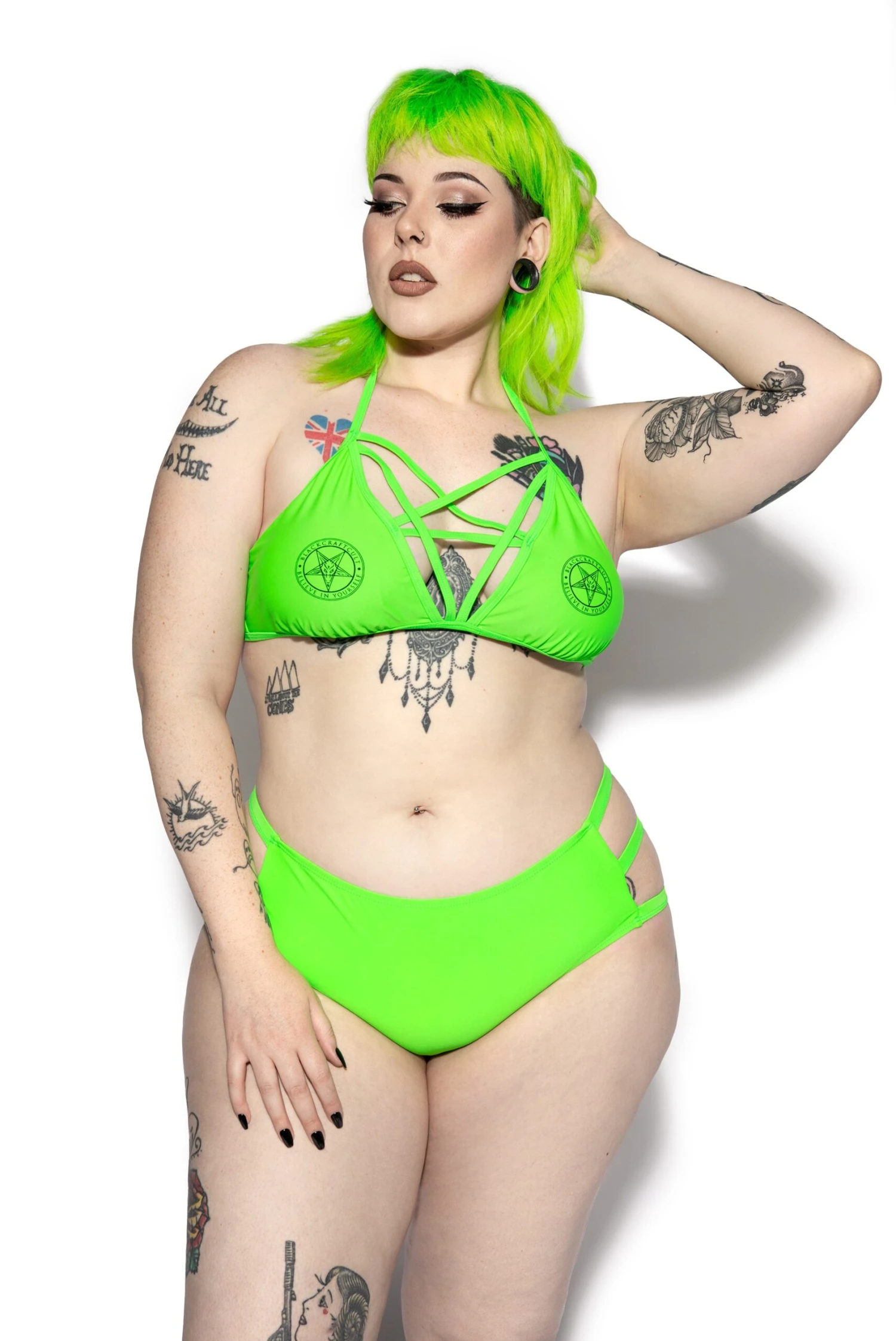 Green strappy bikini top features pentagram straps and Believe In Yourself logo. Tying behind the neck, at the back. Â