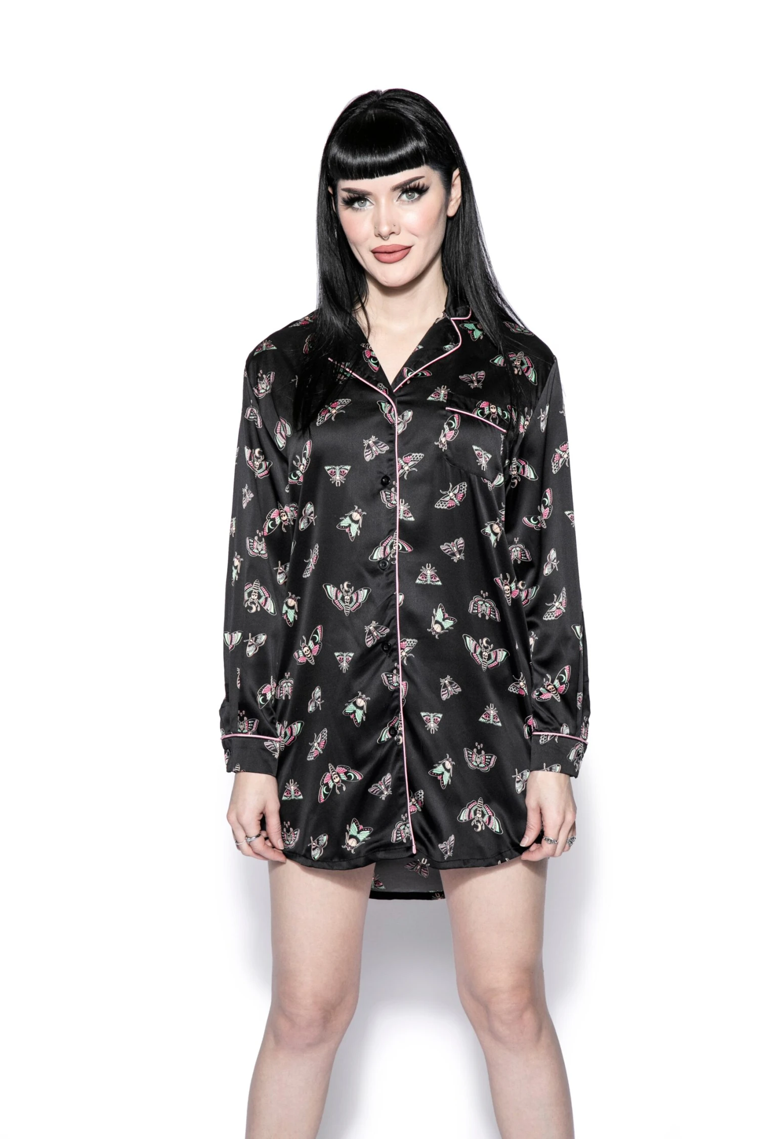 Slip into something dreamy with our satin pajama dress. Featuring long sleeves, button up, and front pocket in an oversized boyfriend shirt style.