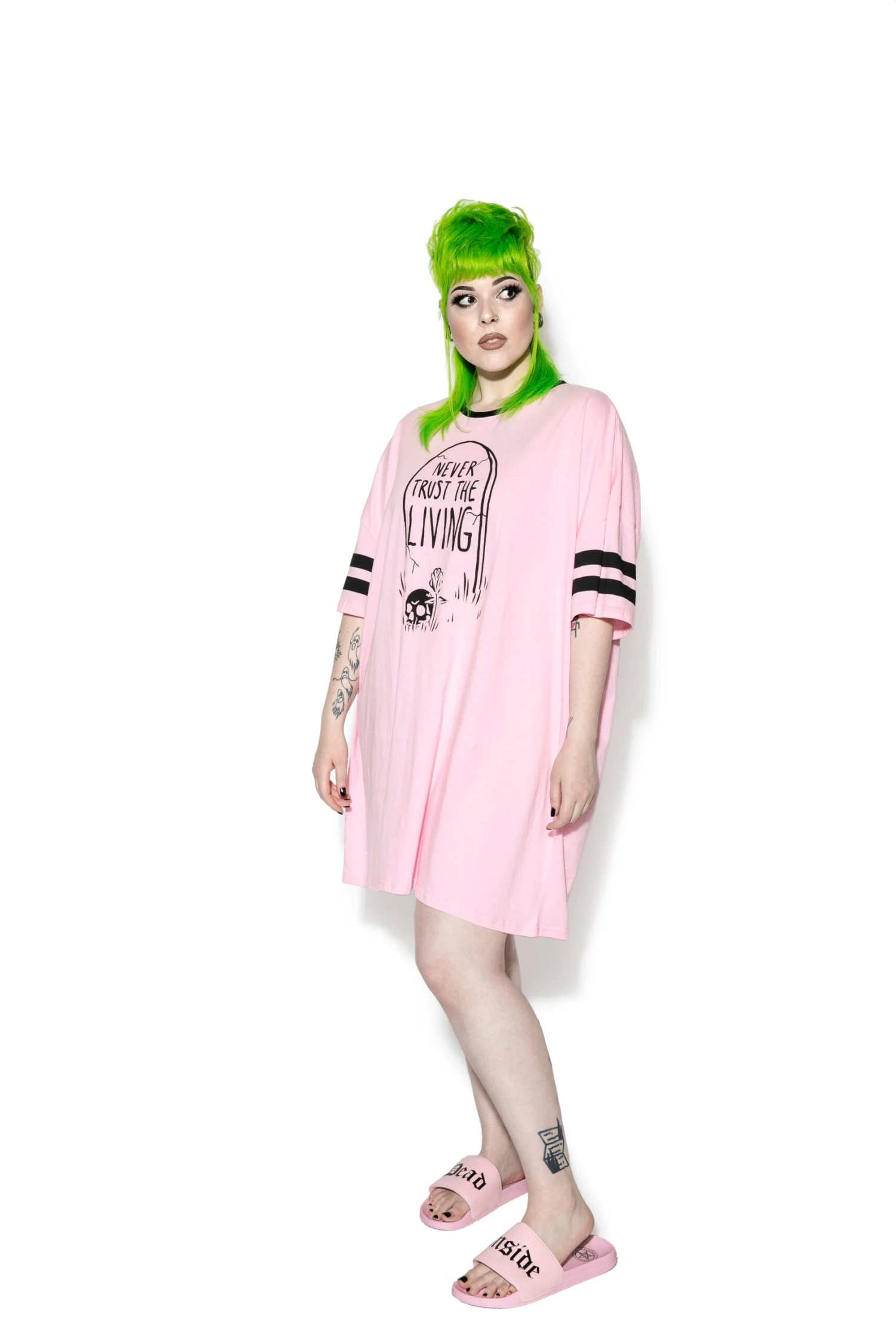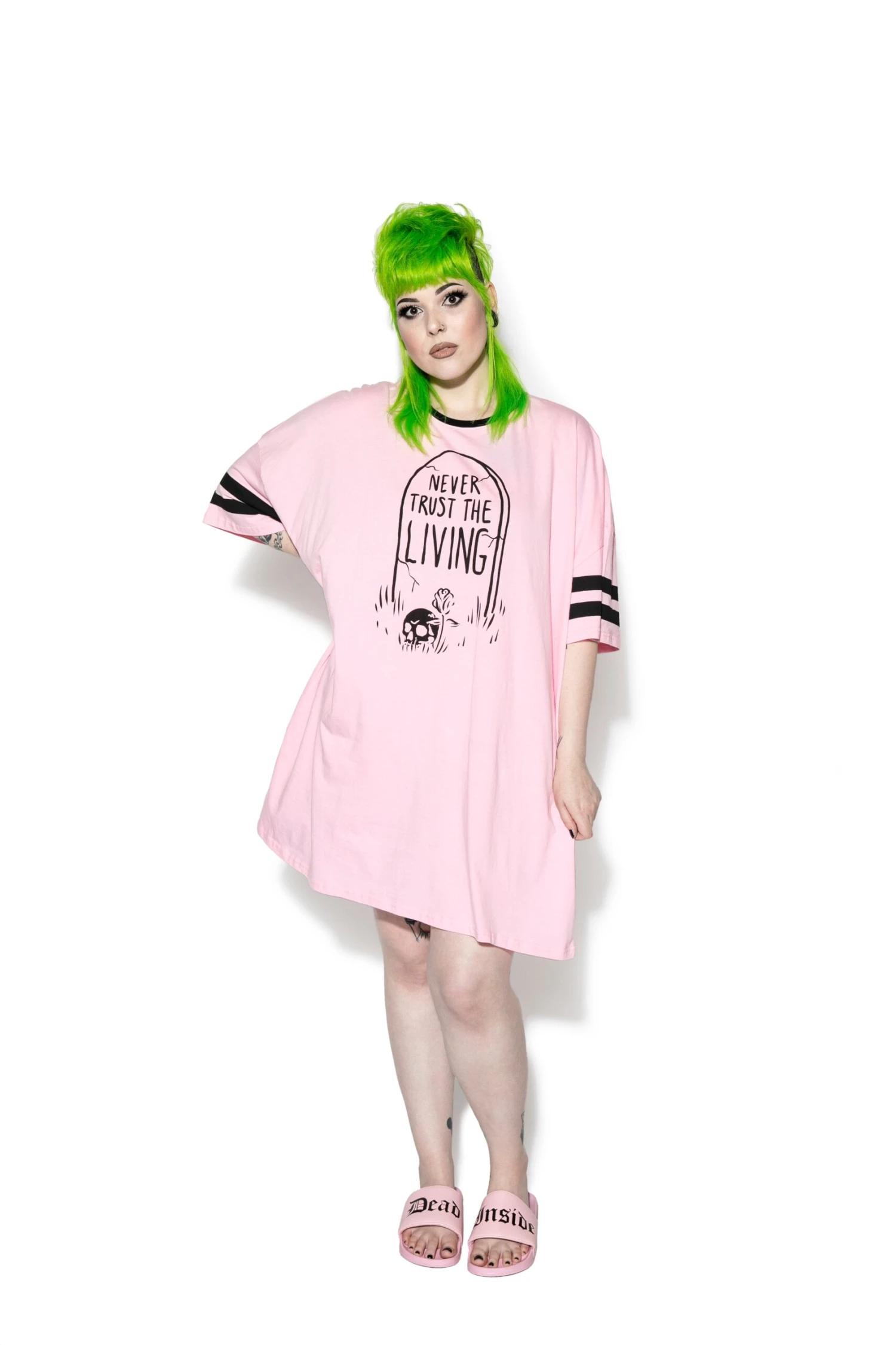 Junior and plus size dorm shirt in pink with Never Trust the Living print across the chest. Black stripe accents on sleeves and neckline.