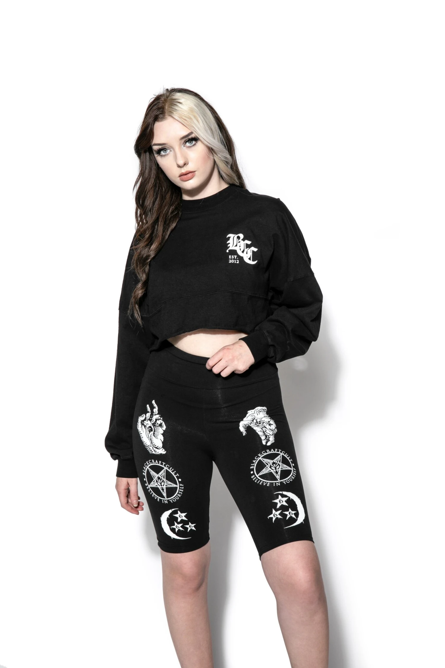 Women’s form fitting bike shorts hitting right above the knee. Features Severed Hands design on the front.