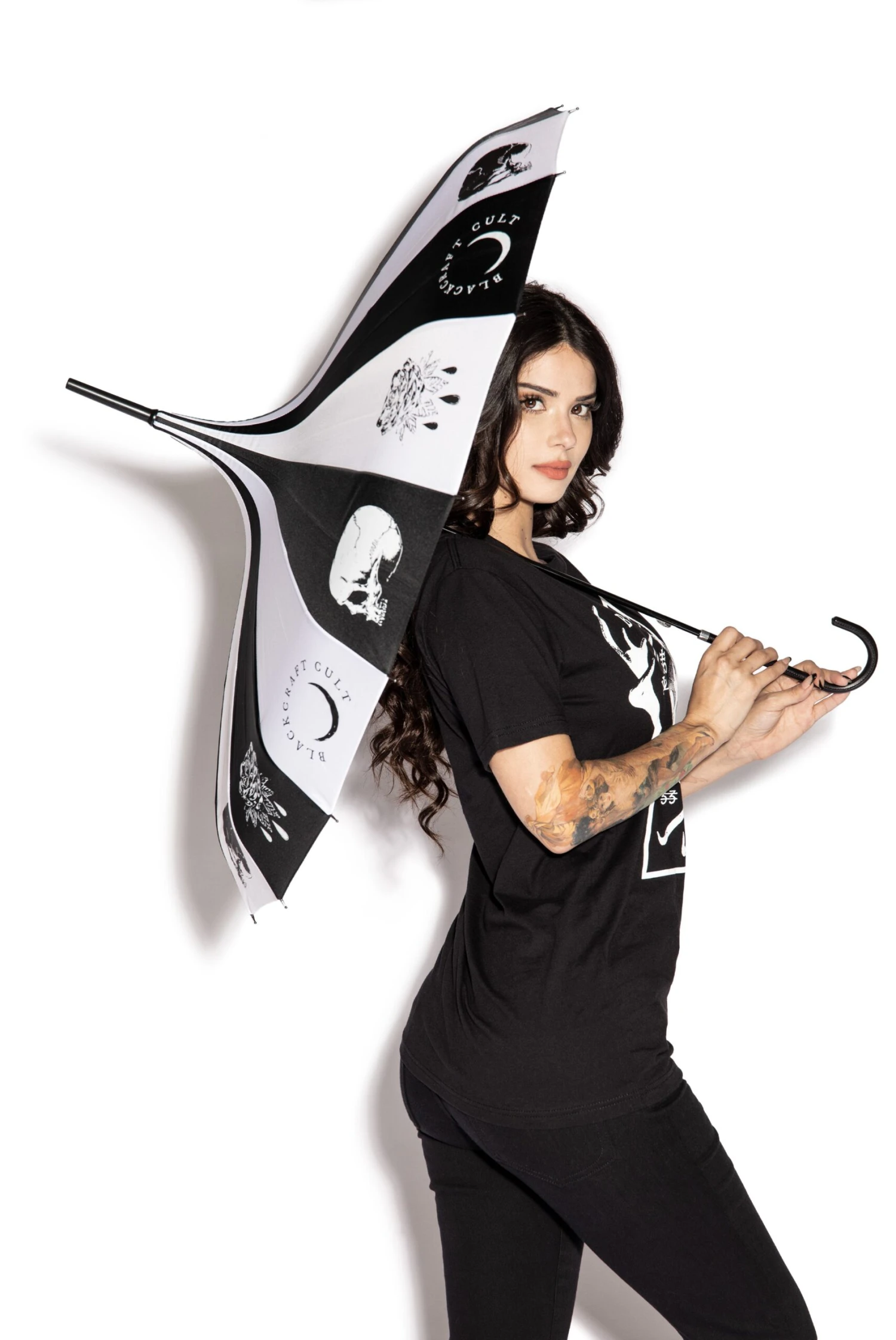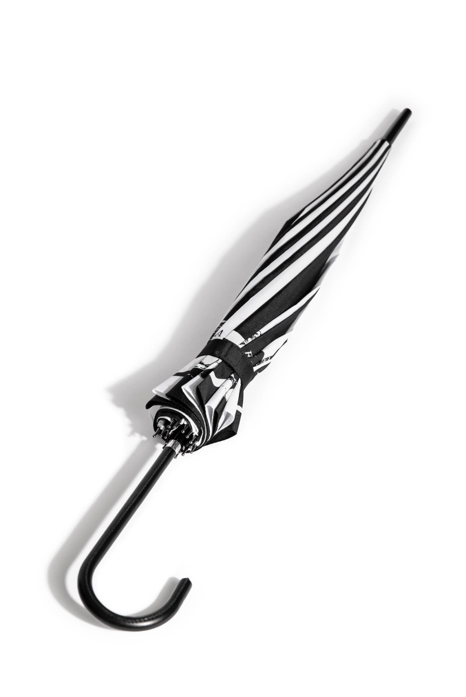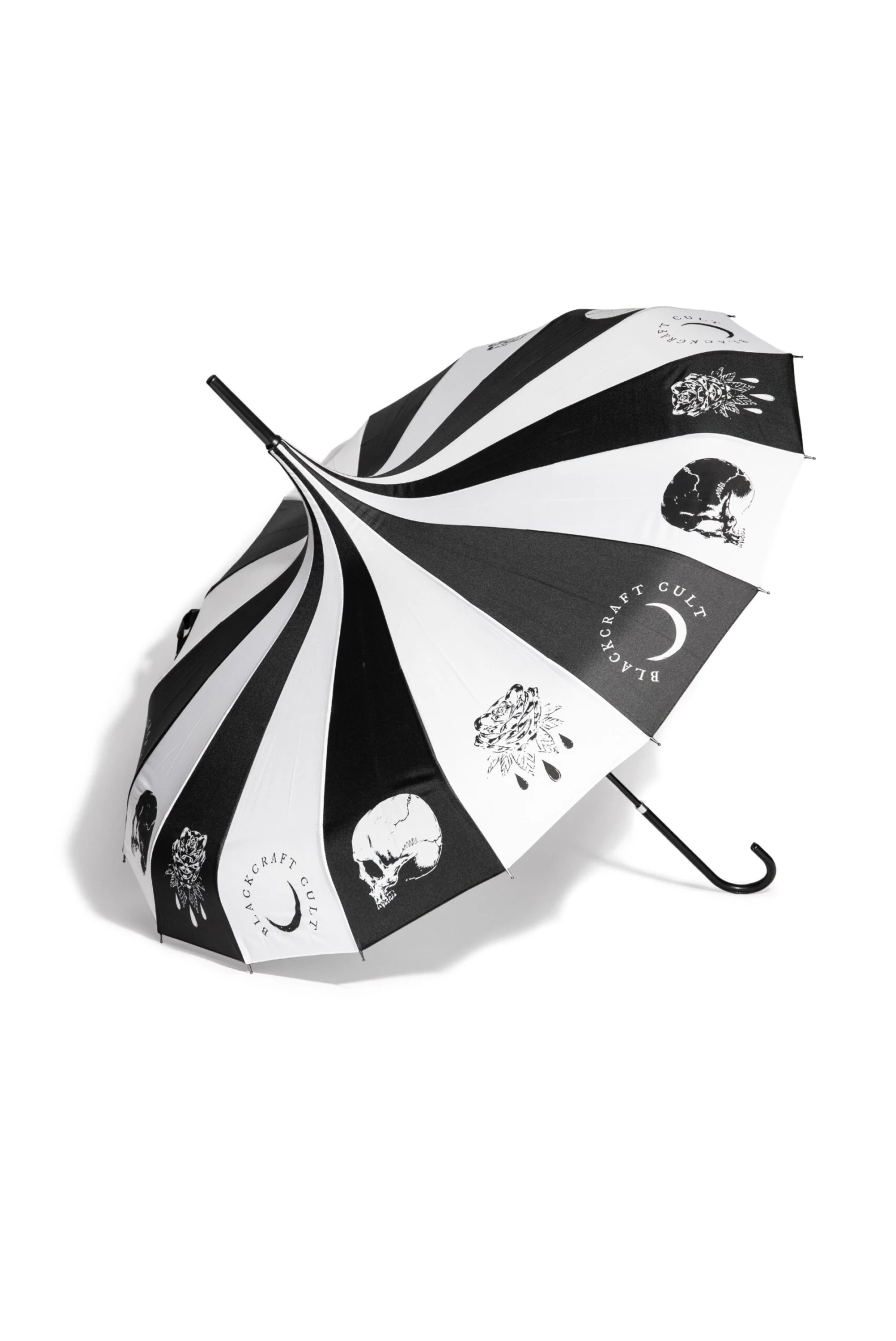The perfect addition for any day, rain or shine. This black and white paneled parasol features Spirits of the Dead artwork all around the edges with a pointed peak. Includes strap for closure and curved handle.